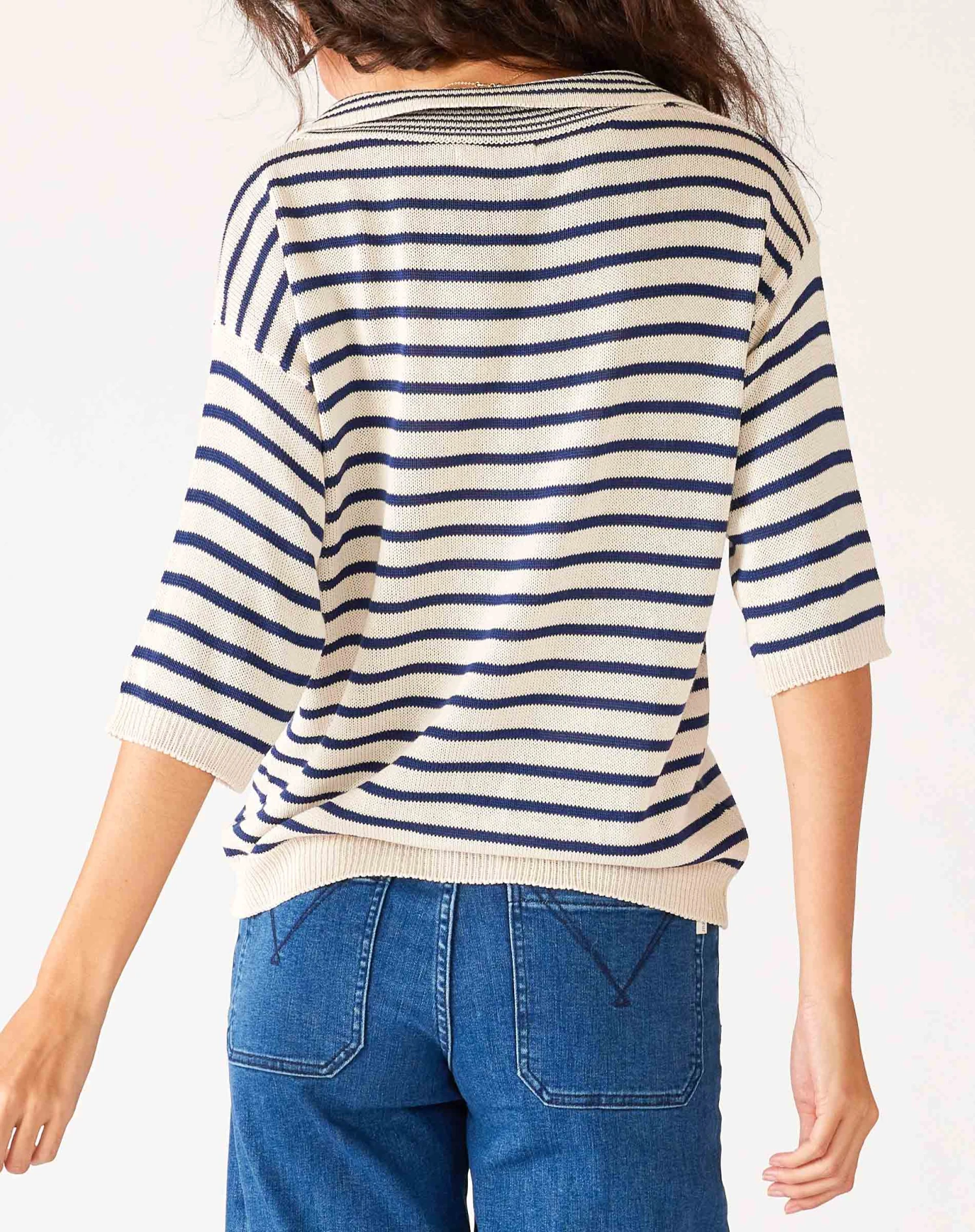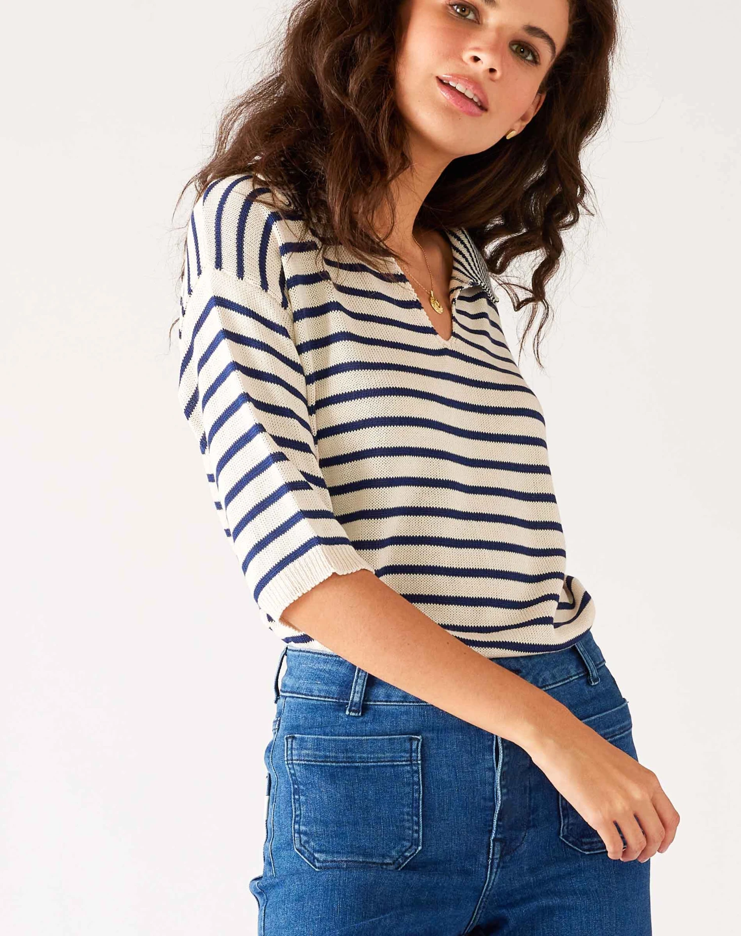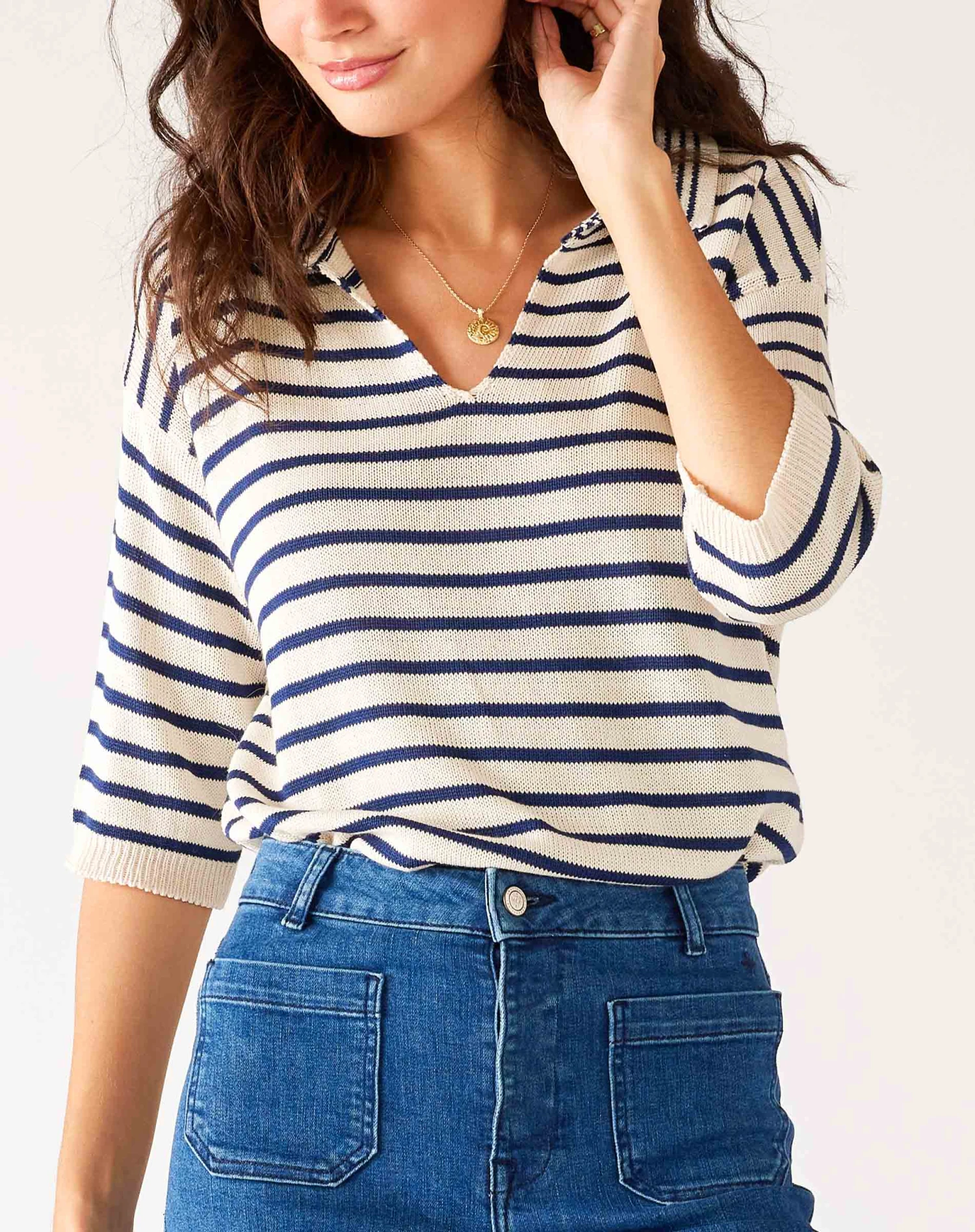 The Breton Polo Sweater is a modern interpretation of the timeless polo style. The relaxed fit, Breton stripes and split collared v-neckline create an effortlessly chic look. Made in Italy from 100% viscose, this silhouette has precision, comfort and classic style.