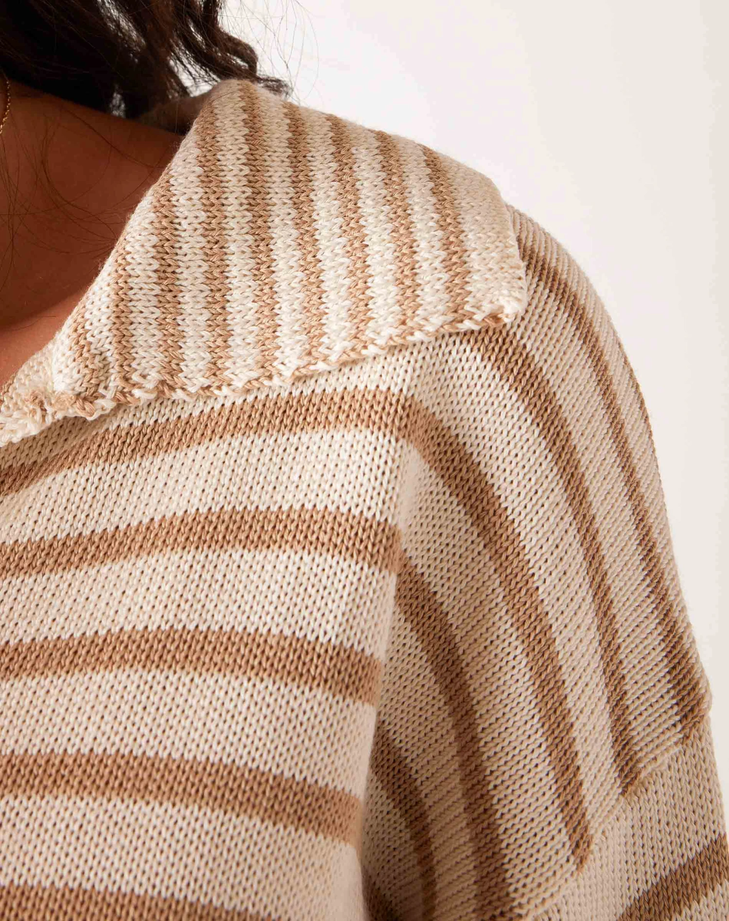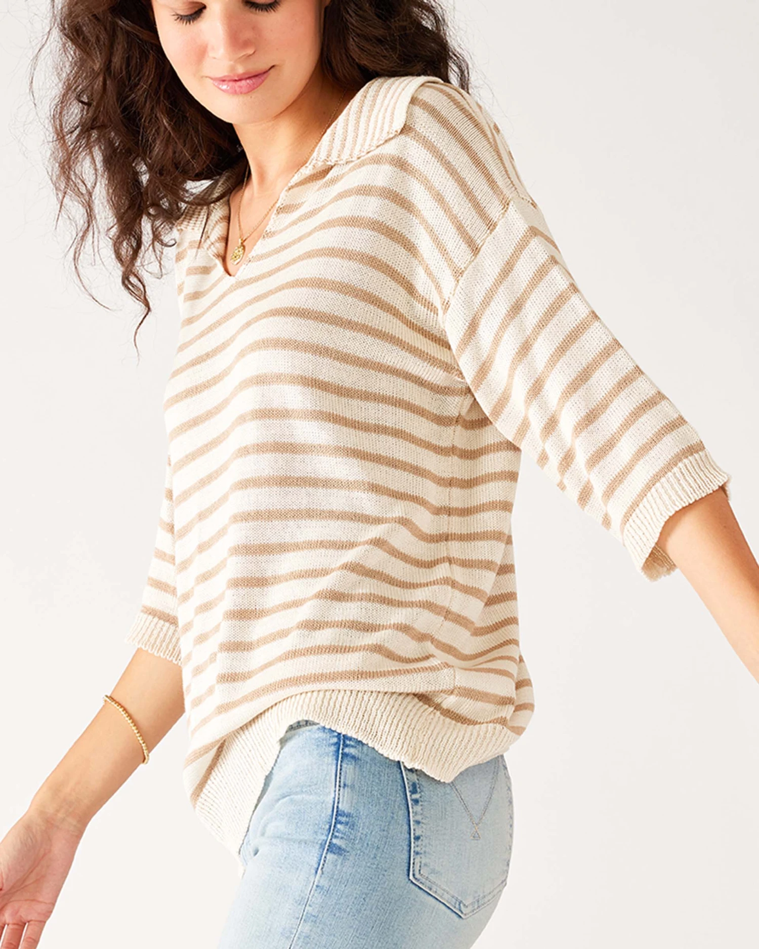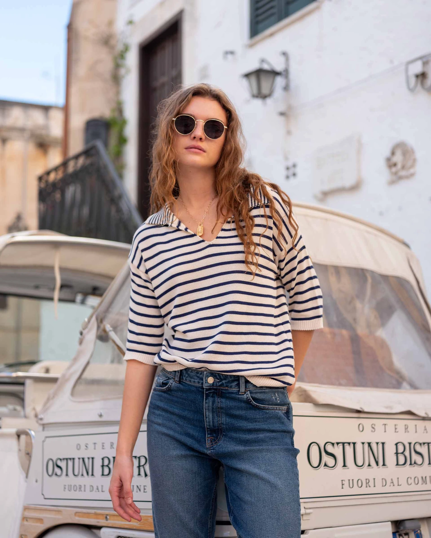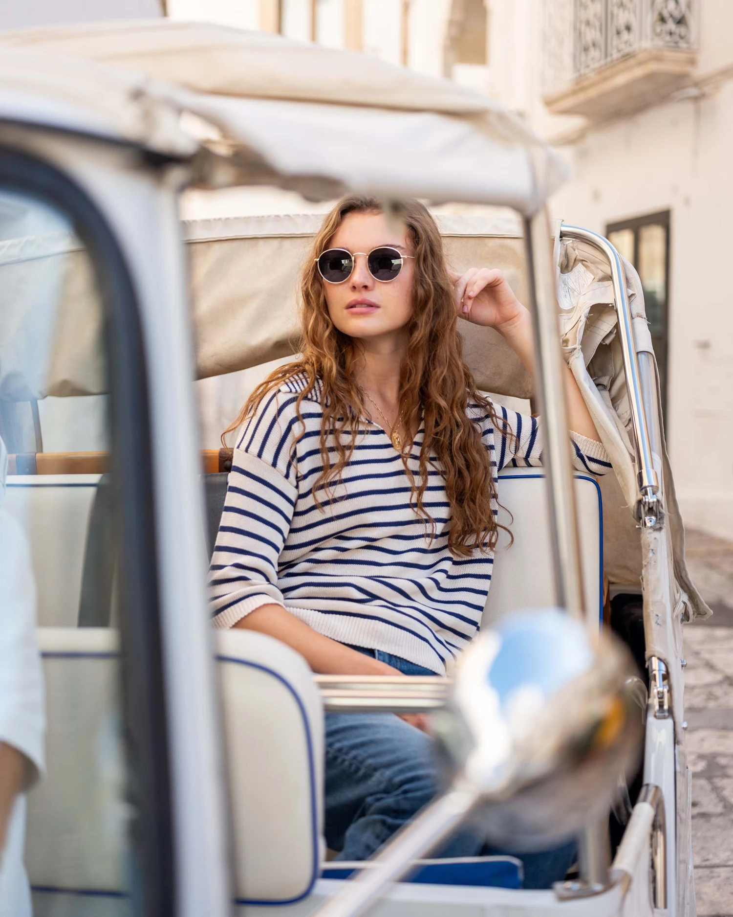 The Breton Polo Sweater is a modern interpretation of the timeless polo style. The relaxed fit, Breton stripes and split collared v-neckline create an effortlessly chic look. Made in Italy from 100% viscose, this silhouette has precision, comfort and classic style.