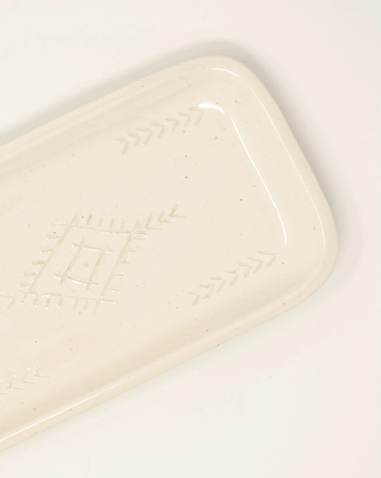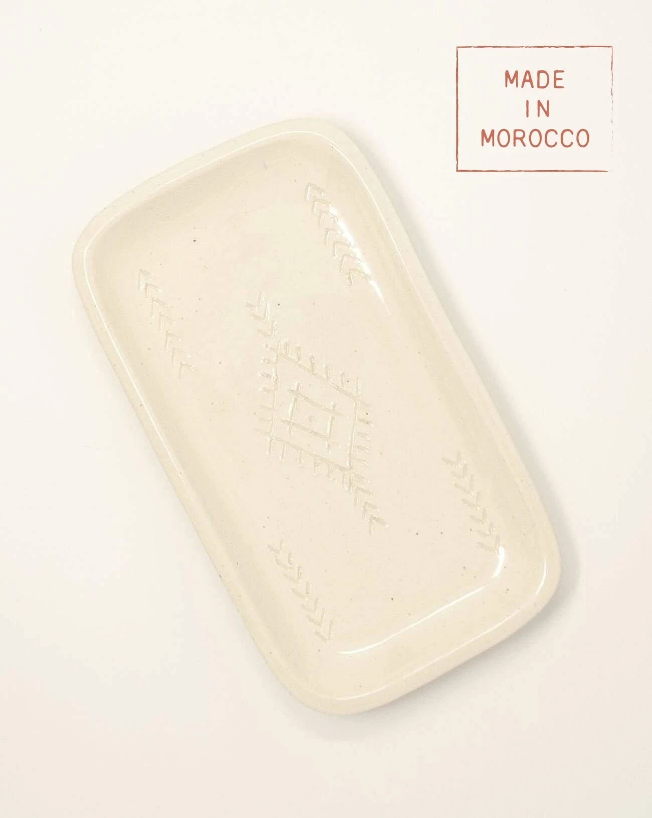 Glazed with a creamy off-white finish, this timeless ceramic tray is hand-made by artisans in Morocco.  The designs are all hand-etched into the clay before it is fired in the kiln, so no two trays are alike. This catch-all tray is the perfect size to hold a hand soap and lotion set, a bar soap, or even your daily pocket treasures like keys and loose change. Â