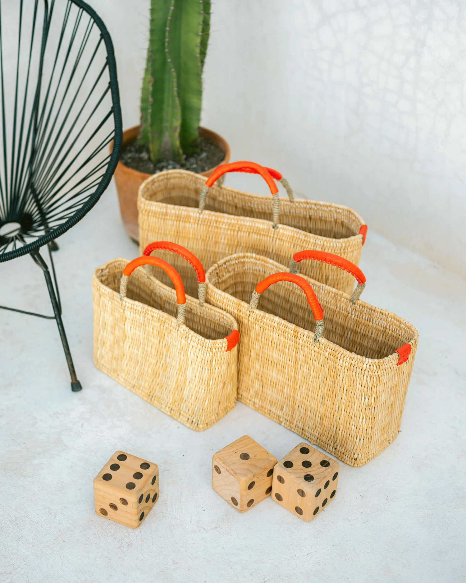 Inspired by the busy souks and ancient walls of Morocco, our Medina Market Basket tells a beautiful story of timeless craftsmanship and care. Handwoven by straw artisans in the coastal town of Essaouira, the market basket stands alone as room décor when accessorizing your home but ideally it will get put to work like its forebears—packed with picnic lunches, sunblock and towels for lazy days at the beach or if you are like us – computers and paperwork. The hand-dyed, hand-sewn leather handles are assembled in another town and finally, they are packed and shipped to you.