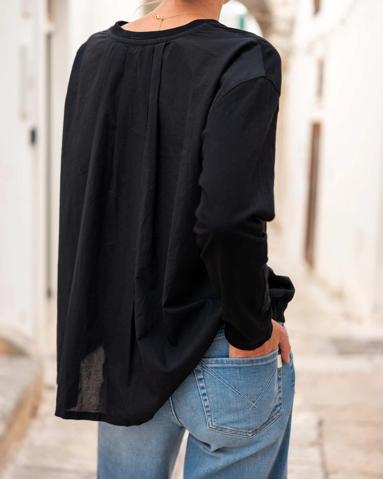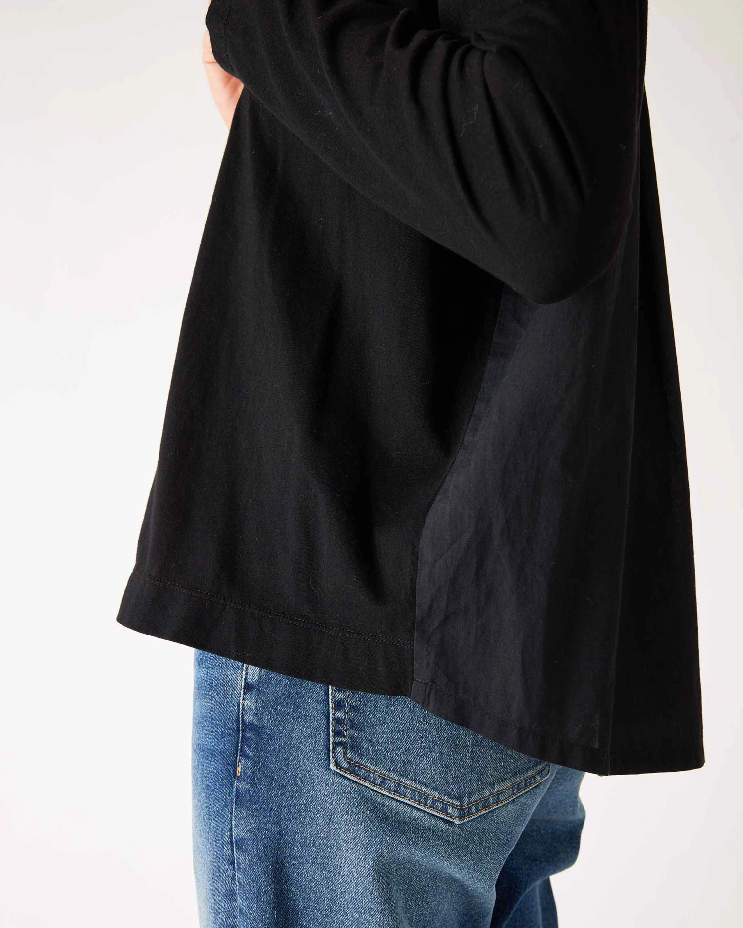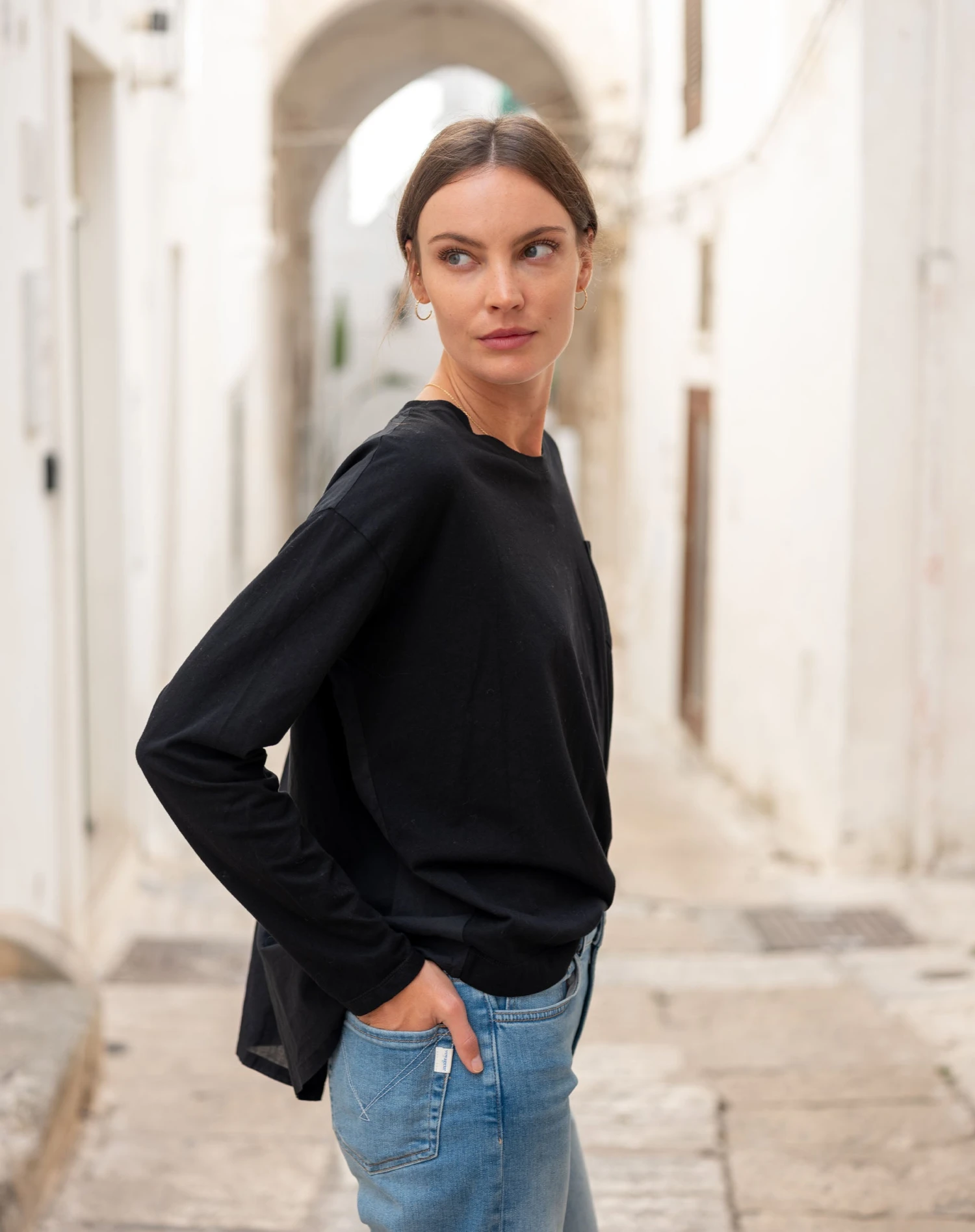 Meet the Moderne Pocket Crewneck Tee – you’ve never seen a tee like this before. The front is soft, jersey knit tee fabric while the back is a light and airy woven cotton poplin. The details make this basic staple the chic essential, with a front pocket and subtle pleats in the back, creating a loose flattering shape. Now, your solution to elevating the plain tee & jeans look is here. Wash cold and tumble dry on low to keep this essential piece in its best shape.Â