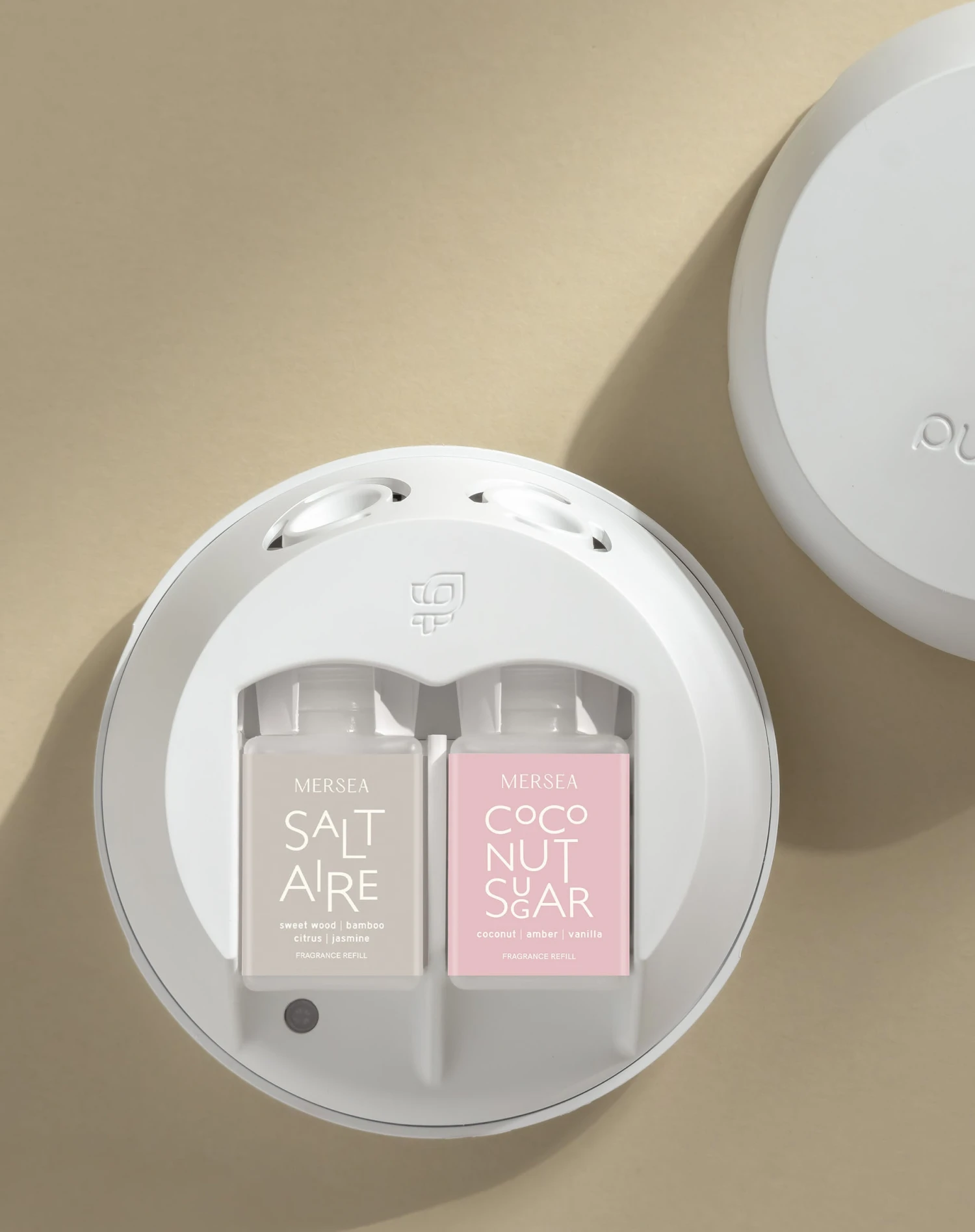 “Smells like home” takes on new meaning with the Pura X MERSEA partnership. Elevate your space with our kit that provides a Pura Smart Diffuser and two of our best-selling scents, Coconut Sugar (coconut | amber | vanilla) and Saltaire (sweet wood | bamboo | citrus | jasmine). This diffuser effortlessly refreshes your space—all you have to do is plug in the device, insert the fragrances and download the app. Now you can control the scent, time and intensity of these aromas right from your phone anytime, anywhere.Â